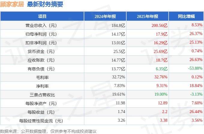 据证券之星公开数据整理,近期顾家家居(603816)发布2025年年报。截至本报告期末,公司营业总收入200.56亿元,同比上升8.53%,归母净利润17.9亿元,同比上升26.37%。按单季度数据看炒股配资指数网站,第四季度营业总收入50.44亿元,同比上升7.82%,第四季度归母净利润2.52亿元,同比上升334.39%。本报告期顾家家居盈利能力上升,毛利率同比增幅0.12%,净利率同比增幅18.84%。