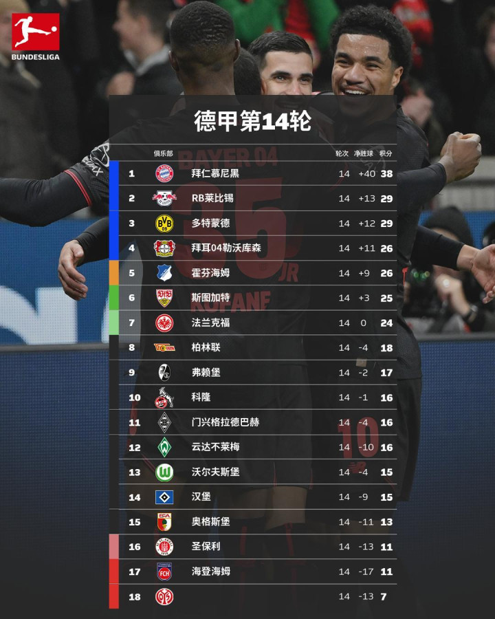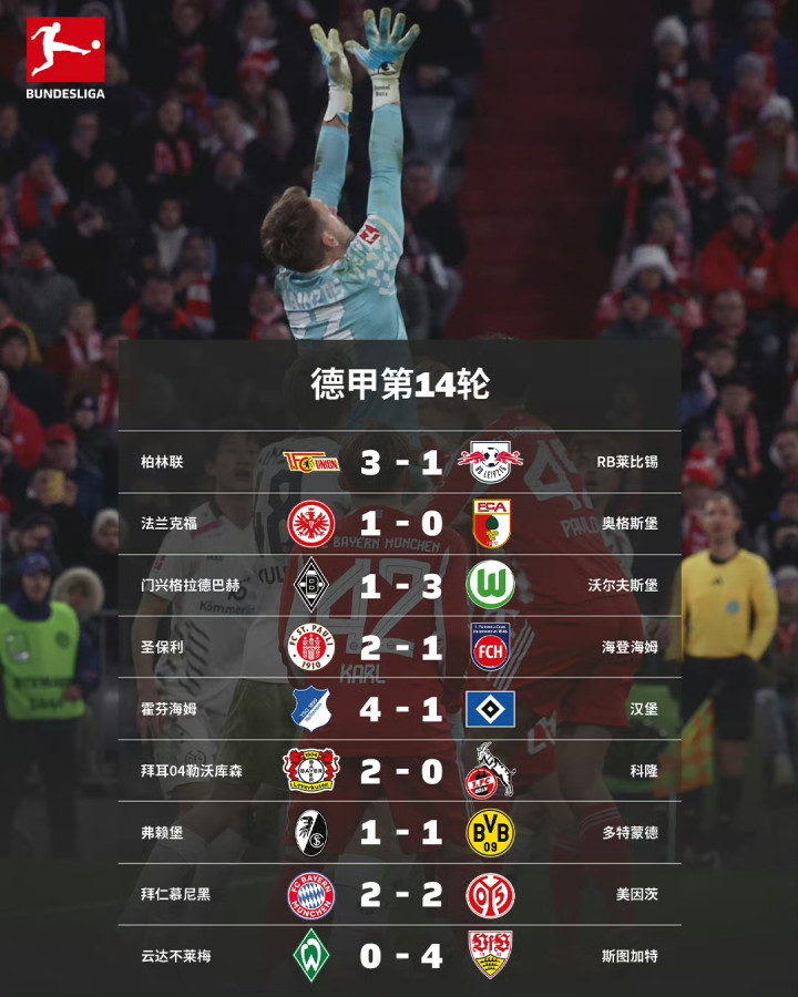 2025/26赛季德甲第14轮比赛于北京时间12月13日凌晨至15日凌晨结束!下面为您带来本轮9场比赛赛况综述:周五场的强势延续,柏林联3-1战胜RB莱比锡;堂安律一剑封喉,法兰克福1-0奥格斯堡;北伐我们来接棒!沃尔夫斯堡客场3-1战胜门兴;十人作战顽强取胜,圣保利2-1力克海登海姆;主场大胜暂列前四,霍芬海姆4-1横扫汉堡;泰里耶蝎子摆尾,药厂主场2-0拿下科隆;本塞拜尼破门,十人多特客平弗赖堡;波图尔斯基、李在城破门,美因茨顽强从慕尼黑带走一分;多点开花,斯图加特客场4-0大胜十人不莱梅。