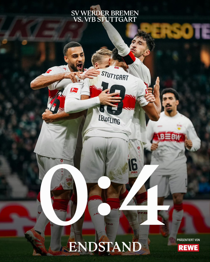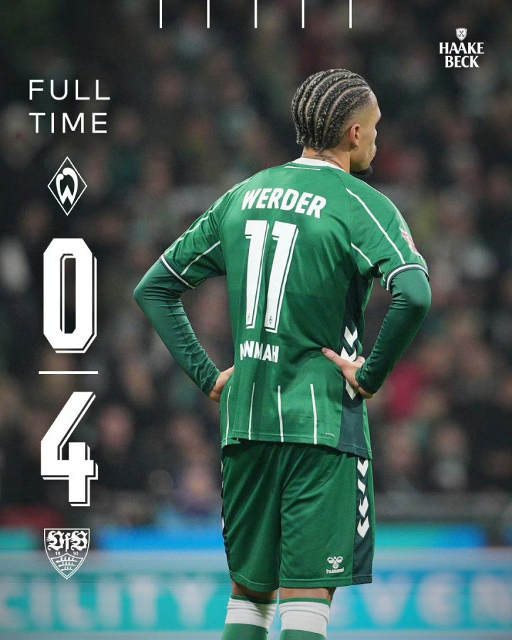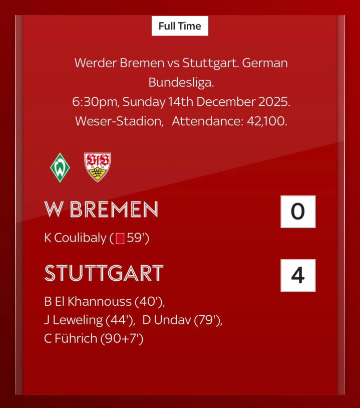 上半场,哈努斯、莱韦林先后进球,斯图加特半场2球领先。下半场,库利巴利两黄变一红被罚下,本就落后的不莱梅被迫少一人作战。随后,翁达夫、菲里希破门扩大比分。最终,斯图加特客场4球大胜对手,不莱梅连续4轮联赛不胜,因为净胜球劣势在积分榜上下降至第12位。
