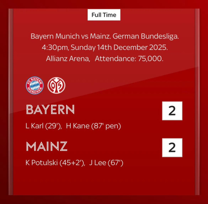 比赛开始阶段,美因茨严防死守,直到第29分钟,格纳布里助攻卡尔打破僵局,拜仁1-0取得领先。上半场伤停补时阶段,美因茨利用前场任意球机会由波图尔斯基扳平比分。下半场,第67分钟,李在城头球抢点破门,美因茨反超比分。第87分钟,凯恩造点并亲自主罚命中,将比分扳平。最终,积分榜垫底的美因茨2-2战平德甲领头羊,从安联球场带回1分,终结拜仁德甲4连胜。但由于本轮莱比锡和多特蒙德都未能赢球,拜仁在积分榜上的领先优势扩大到9分。