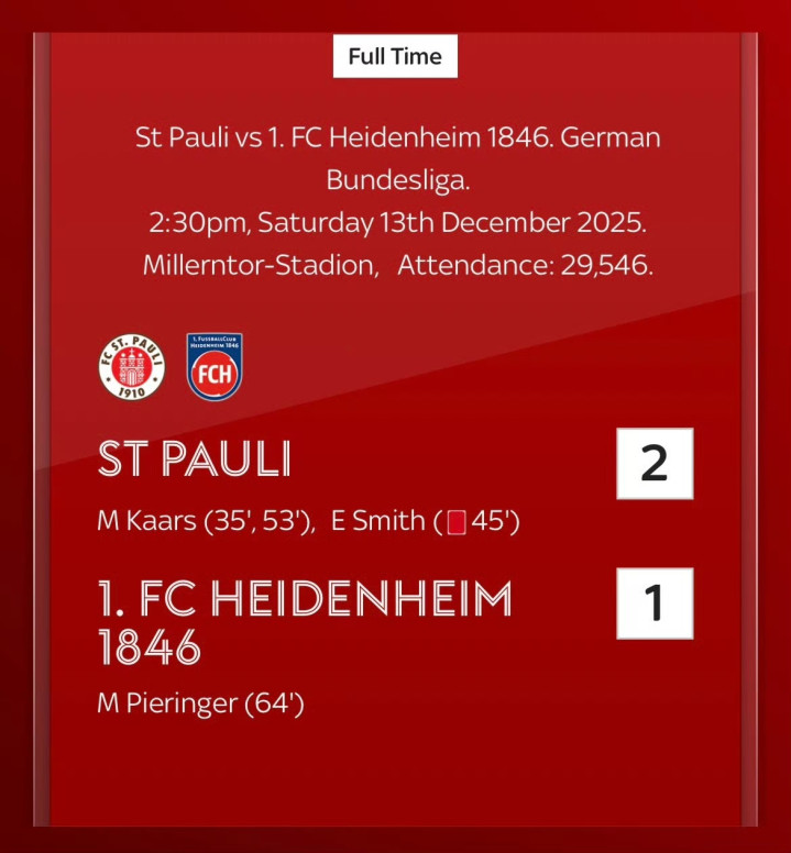 进入12月两队都逐渐找到状态,本轮率先进入比赛节奏的是主队圣保利,卡尔斯精巧射门打入球门上角帮助球队1-0领先。半场尾声阶段史密斯犯规吃到红牌被罚下场。下半场,卡尔斯单刀破门上演梅开二度;皮林格尔为客队扳回一城。最终圣保利主场2-1力克海登海姆,凭借这场胜利反超对手来到积分榜第16位,暂时逃离直接降级区。