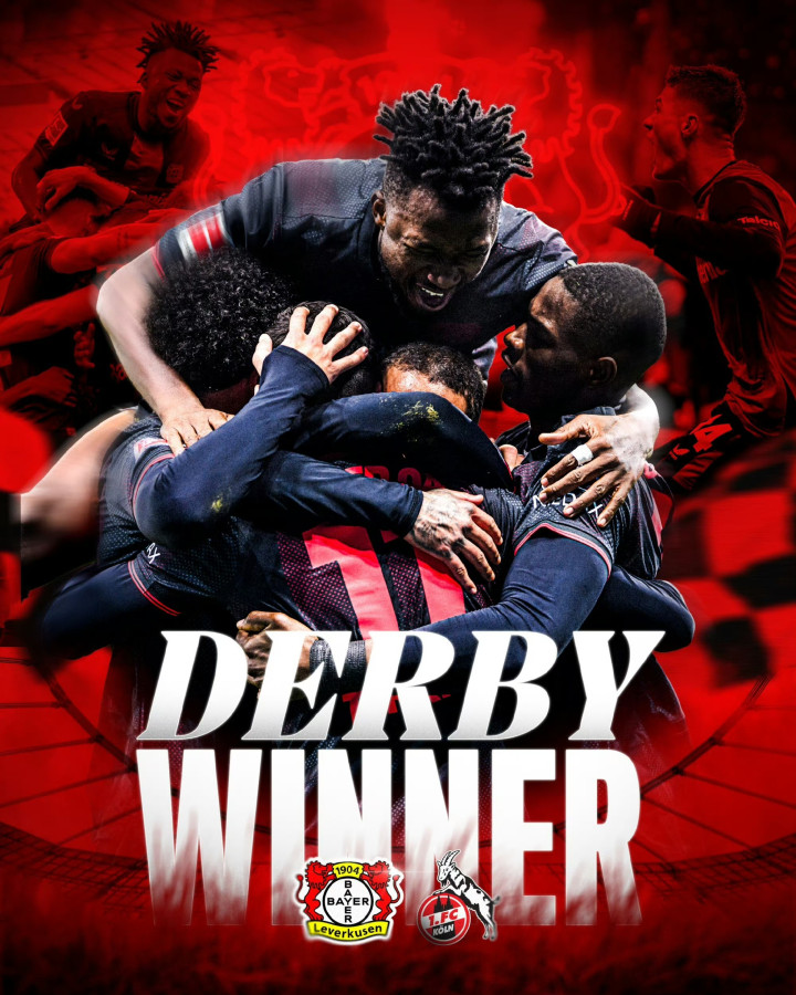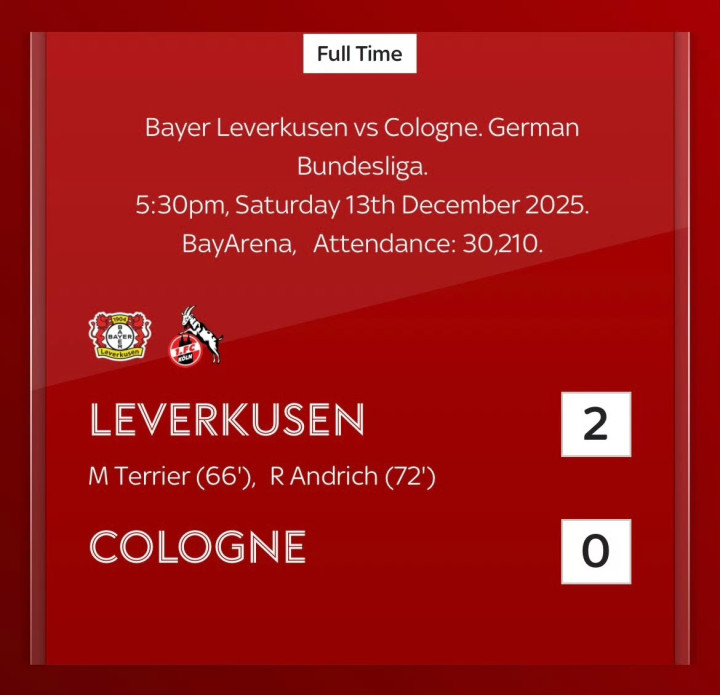 上半场双方互有攻守,施韦贝发挥神勇多次力保科隆城门不失。下半场第66分钟,阿图尔与加西亚完成一次漂亮的二过一配合后,前者从右路送出一记传中,泰里耶完成一粒技惊四座的蝎子摆尾,帮助药厂1-0取得领先;第73分钟,加西亚开出角球,安德里希头球破门。最终勒沃库森2-0完胜科隆,赢下莱茵德比,而科隆近5轮联赛取得2平3负难求一胜。