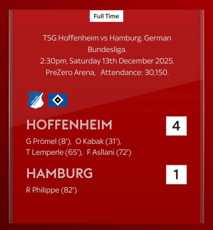 此前刚刚收获德甲两连胜的汉堡客场挑战霍芬海姆。上半场主队就牢牢把握住局势,普勒梅尔传射建功帮助球队取得2-0领先;易边再战后霍村火力依旧,伦珀勒、阿斯拉尼破门帮助主队4-0领先。终场前菲利佩破门为汉堡扳回一城,但随后他主罚点球打飞。最终霍芬海姆4-1横扫汉堡,取得联赛主场4连胜。