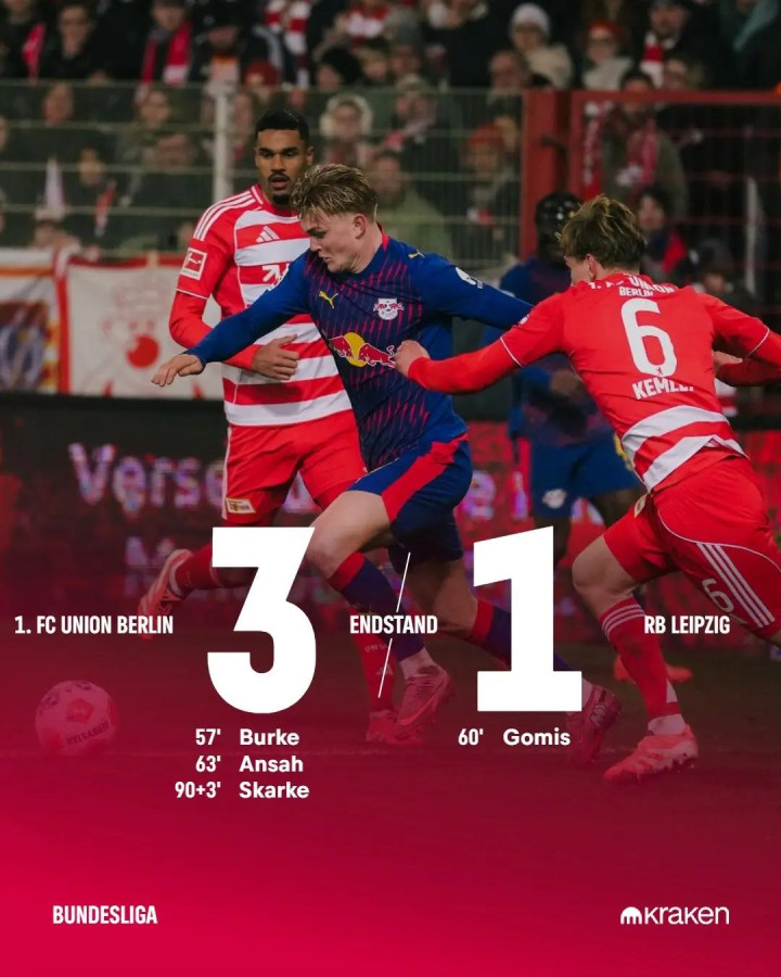 上半场迪奥曼德屡造险情,伦诺夫多次扑救力保城门不失;下半场第57分钟,柏林联发动反击,伯克打破僵局,柏林联1-0领先;仅3分钟后哈德送出直塞,戈米斯劲射破门,帮助莱比锡扳平比分,这也是他的德甲首球;第64分钟,特里梅尔精准长传助攻安萨头球破门;补时阶段伊利奇倒地助攻斯卡克破门锁定胜局。最终柏林联3-1战胜RB莱比锡,连续10场德国时间周五晚场比赛保持不败。