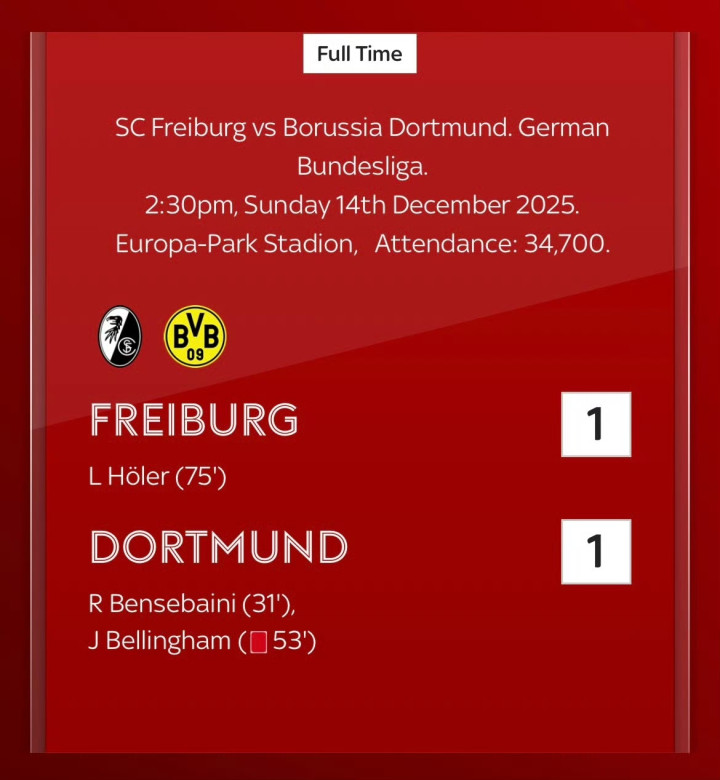 上半场本塞拜尼为多特蒙德首开纪录。易边再战,主场作战的弗赖堡拿回了比赛主动权,第53分钟,乔布·贝林厄姆犯规被红牌罚下,多特蒙德被迫10人应战。此后,弗赖堡加强进攻,在第75分钟由赫勒扳平比分。最终弗赖堡主场1-1战平多特蒙德。