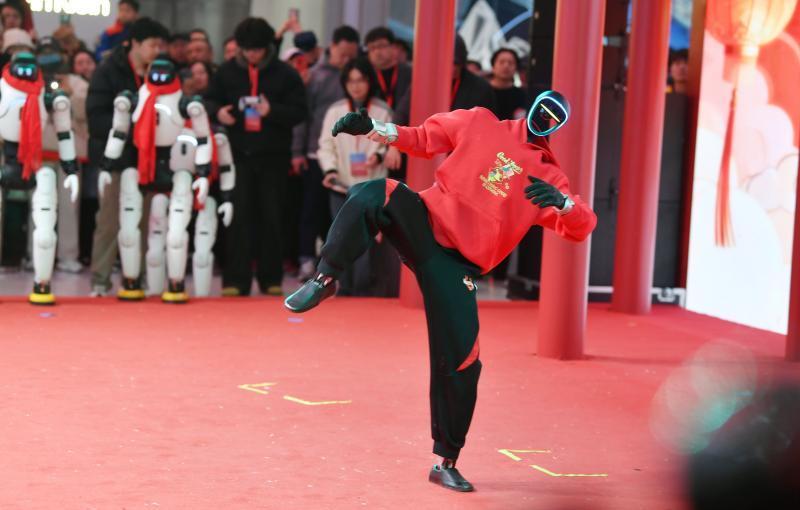 作为海淀科创实力的全景秀场,本届科技庙会最突出的亮点是“科技感”与“国际范”的双重升级。现场不仅云集43项具身机器人展项,更有AI大模型、数字人、VR、AIGC等前沿科技互动体验,AI芯片塔直观展现海淀智造的硬核实力。其中,央视春晚同款机器人组成的“天团”成为现场焦点,与小朋友共跳英歌舞、化身“赛博瑞狮”送福、组建乐队开展人机合奏《好运来》;硅基公园携手多款顶尖机器人献上京剧、截拳道等互动串烧,让新春年味与硬核科技完美交融。