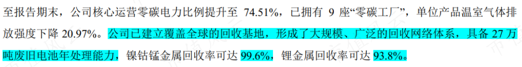 在电池回收领域,其镍钴锰金属回收率可达99.6%,锂金属回收率可达93.8%,子公司邦普循环2024年废旧电池综合回收利用量为12.87万吨,位列国内第一。