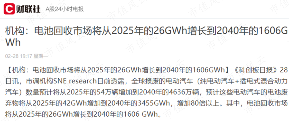 从全球范围来看,市调机构SNE research曾在今年2月份表示,全球报废电动汽车的数量预计将从2025年的54万辆增加到2040年的4636万辆,这些电动汽车的电池废弃物将由42GWh增加到2040年的3455GWh,增加80倍以上。