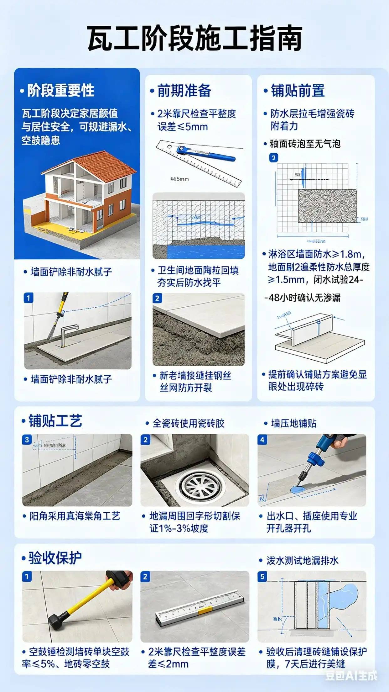 前期准备:筑牢基础是关键墙面需铲除非耐水腻子至坚实基层,用2米靠尺检查平整度(误差≤5mm)配资平台股票,新砌墙与旧墙接缝处挂钢丝网防开裂。地面重点处理卫生间配资平台股票,建议用陶粒回填并分层夯实,再做防水找平。防水施工需达标:淋浴区墙面防水高度≥1.8m,地面刷2遍柔性防水(总厚度≥1.5mm),完成后进行24-48小时闭水试验,确认楼下无渗漏。铺贴前还有两个核心步骤:一是防水层需做“拉毛处理”,制造粗糙面增强瓷砖附着力;二是瓷砖按需处理,釉面砖需泡至不冒气泡,全瓷砖则需搭配瓷砖胶使用。同时提前确认铺贴方案,避免显眼位置出现碎砖。铺贴工艺:细节决定品质铺贴遵循“墙压地”原则,先铺地砖再补墙砖最后一排,防止墙面水渗入地砖缝。阳角采用“真海棠角”工艺(45°切割拼接),比阳角条更美观耐用。地漏周围做“回”字形切割,保证1%-3%的排水坡度,避免积水。出水口、插座等位置用专业开孔器开孔,确保切口平整不崩瓷。验收保护:守住最后一道关验收时用空鼓锤检测,墙砖单块空鼓率≤5%,地砖零空鼓;2米靠尺检查平整度,误差≤2mm。泼水测试地漏排水,确保水流顺畅无积水。验收合格后立即清理砖缝,铺设保护膜防止后续施工划伤瓷砖,美缝需在铺贴7天水泥干透后进行。专题 | 装修小白刚需疑似使用AI生成,请谨慎甄别举报/反馈